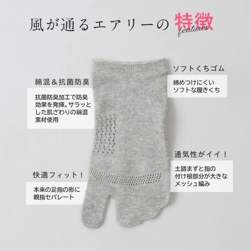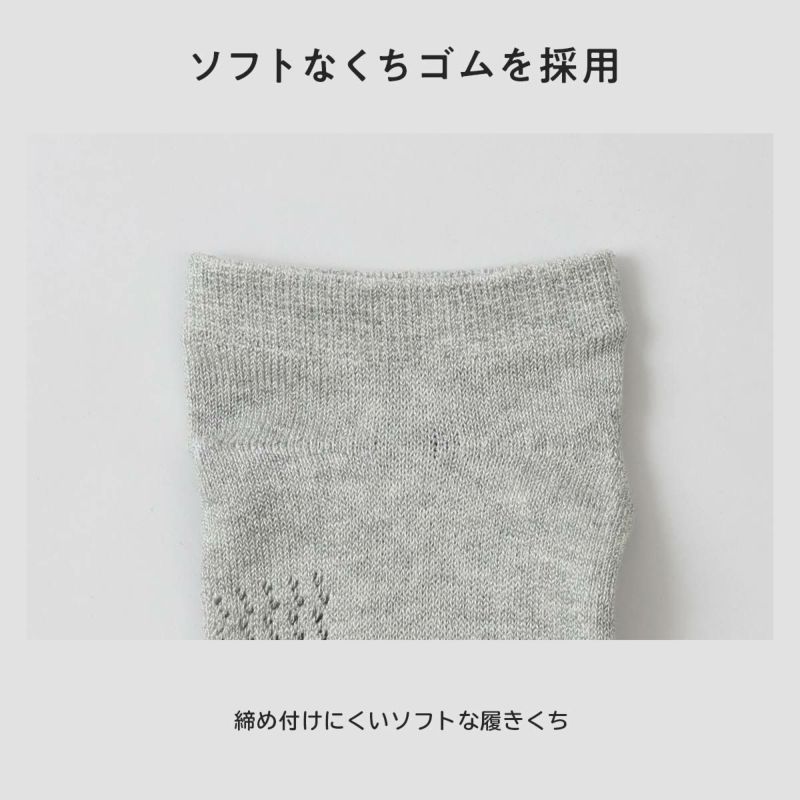 土踏まずと指の付け根部分が大きなメッシュ編みに。風を通してムレ感を軽減。
