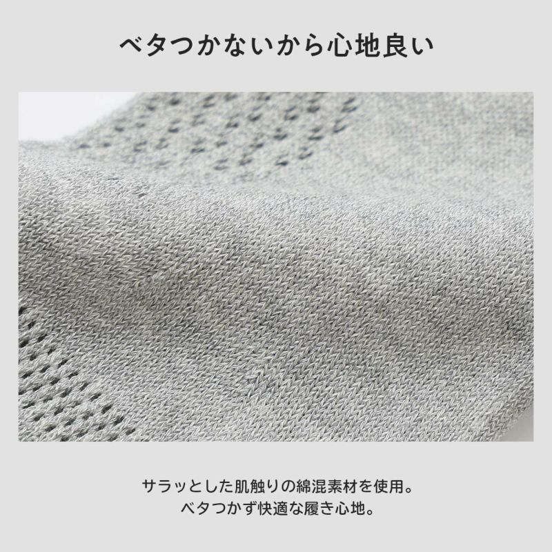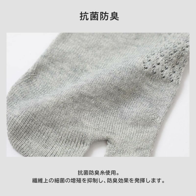 サラッとした肌触りの綿混素材を使用しており、ベタつかず快適な履き心地です。また、抗菌防臭糸使用。繊維上の細菌の増殖を抑制し、防臭効果を発揮します。