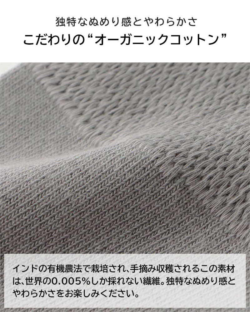インド産オーガニックコットン混素材ですので、独特なぬめり感と足元を包み込む優しい履き心地を体感いただけます。