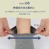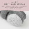 パンプスの中で縮こまった足指をパイルのループを使ってグッと広げます。足底にクッションがあり、着用するだけで気持ち良く刺激を与えます。かかと部分にはシートが付いているので、保湿クリームを塗った かかとを包み込み しっとり感をキープしやすいのもポイント。