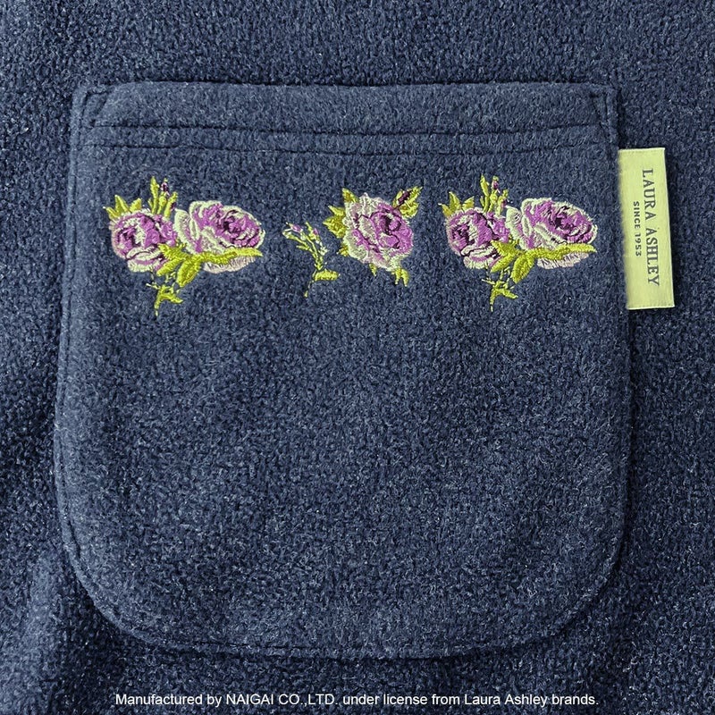 パジャマやルームウェアの上に羽織れるゆったりしたサイズ感。ポケットにクチュールローズ柄のバラをモチーフにした刺繍が施してあり、大輪のバラが心までぱっと明るくしてくれるような、エレガントかつ華やかな柄です。