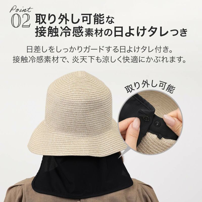 首元までカバーするたれ部分には接触冷感生地を使用し、ひんやり心地よく快適な着用感を実現。