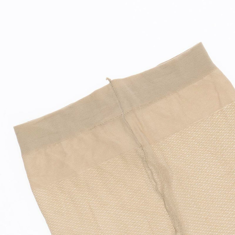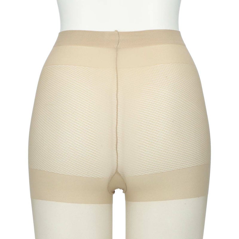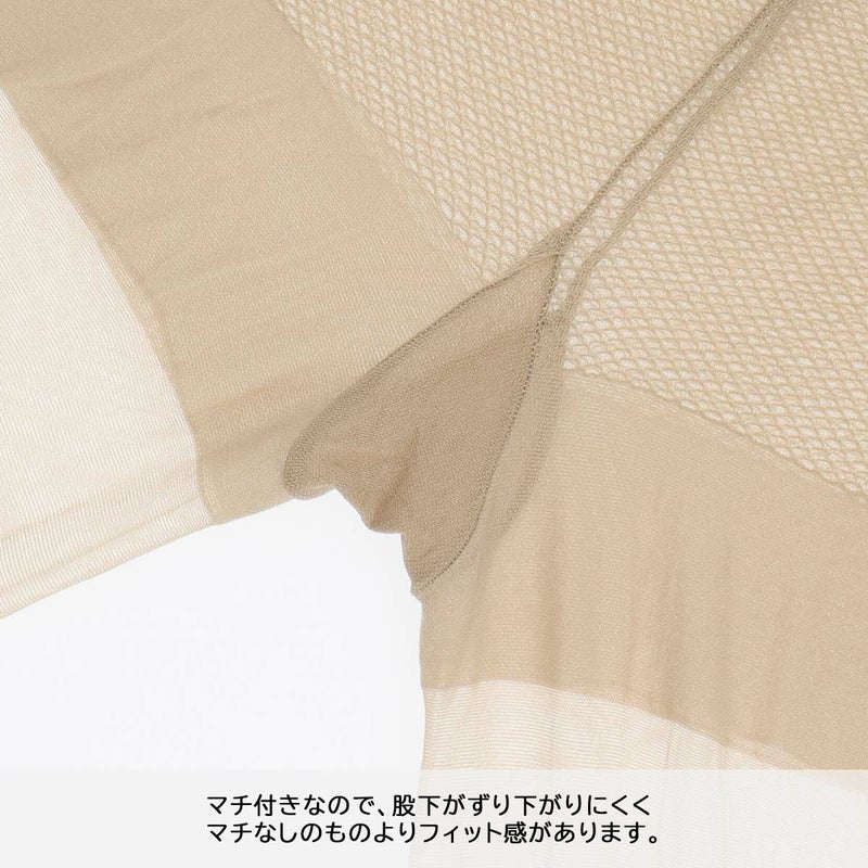 パンティー部がメッシュ編みなので通気が良く、本体部にはサラッとした肌触りが続く高吸放湿性ナイロン(東レ「QUUP」)を使用。暑い時期に重宝するシアーサポートストッキングです。