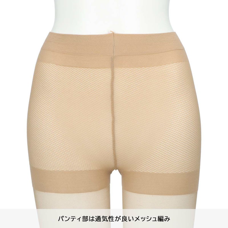 パンティー部がメッシュ編みなので通気も良く、本体部には高吸放湿性ナイロン(東レ「QUUP」)を使用したシアーサポートストッキングです。(SCY交編、マチ付、パンティ部メッシュ編み、つま先部スルー、キシリトール加工、足形セット、ゆったりサイズ)