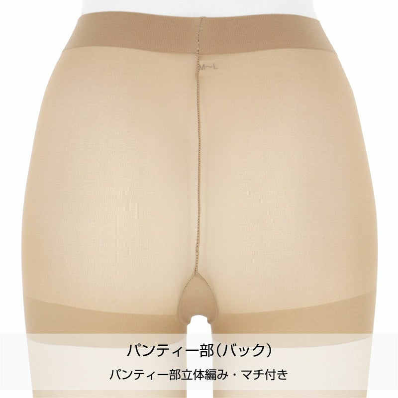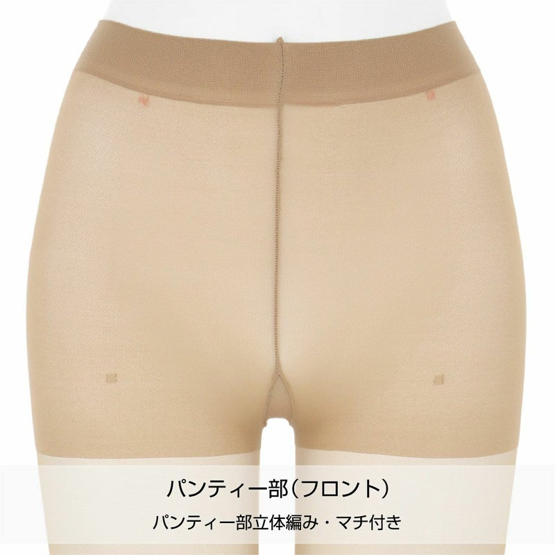 仕様 セラミド加工でしっとりした肌触り、ハイゲージ編みで透明感抜群、パンティ部立体編み、マチ付き、UV対策、静電気防止加工、ウエスト幅広仕様(約45mm幅)&フラット面でやさしくフィット