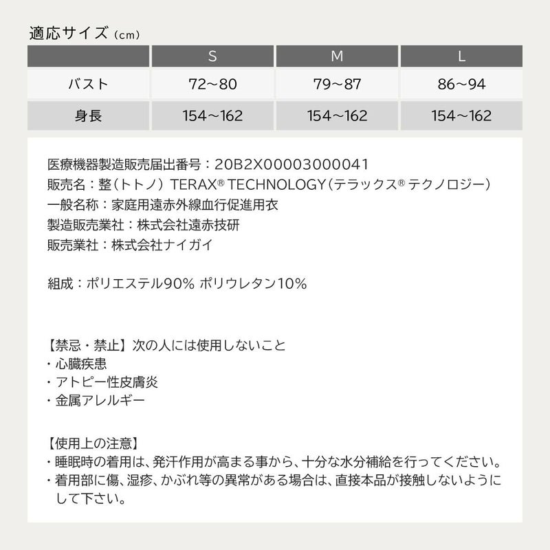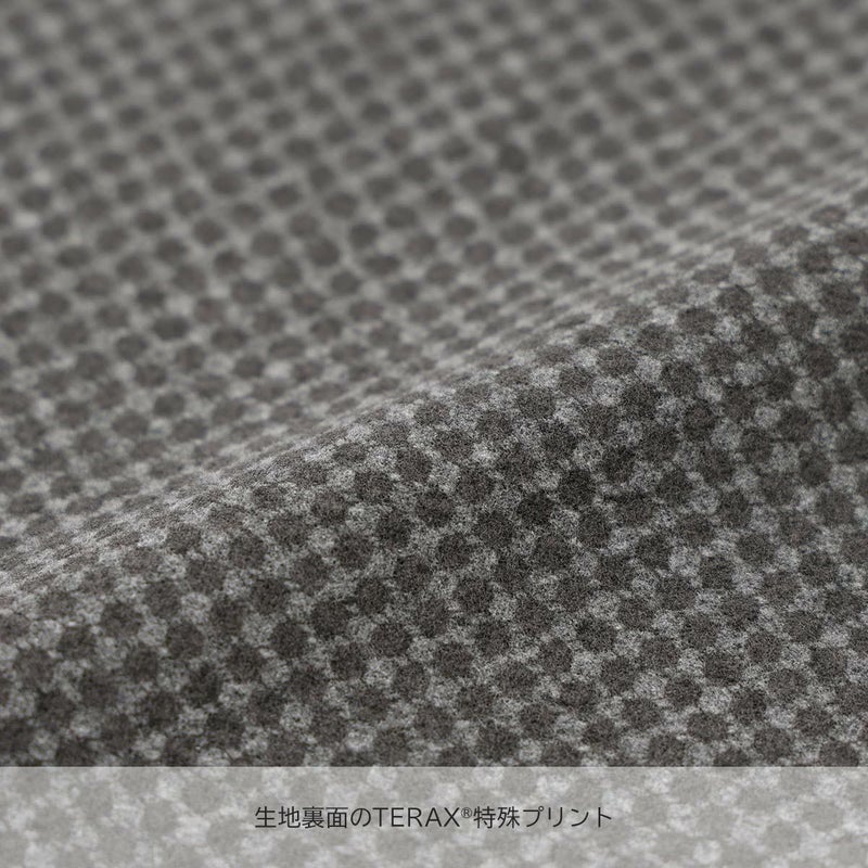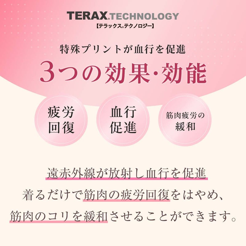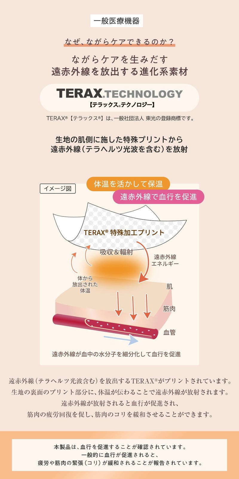 生地に遠赤外線を放出する進化系素材「TERAX® TECHNOLOGY(テラックス® テクノロジー)を使用。体から出る熱(体温)を吸収し、再び遠赤外線として体に戻すことで、血行を促進し、疲労回復、筋肉の疲労を緩和します。