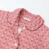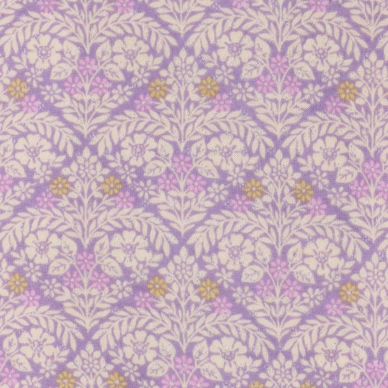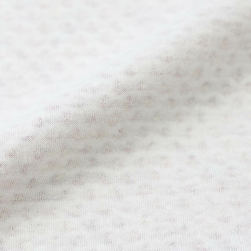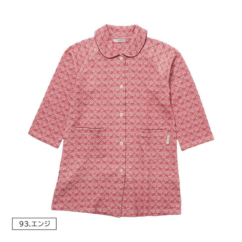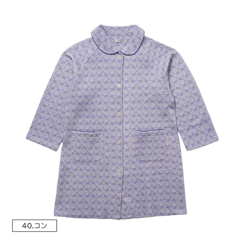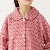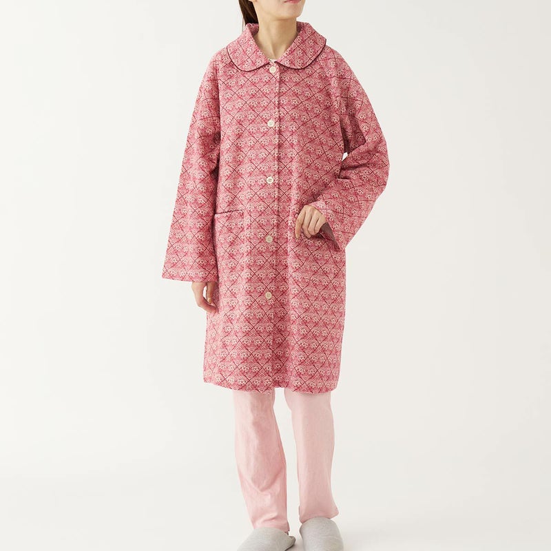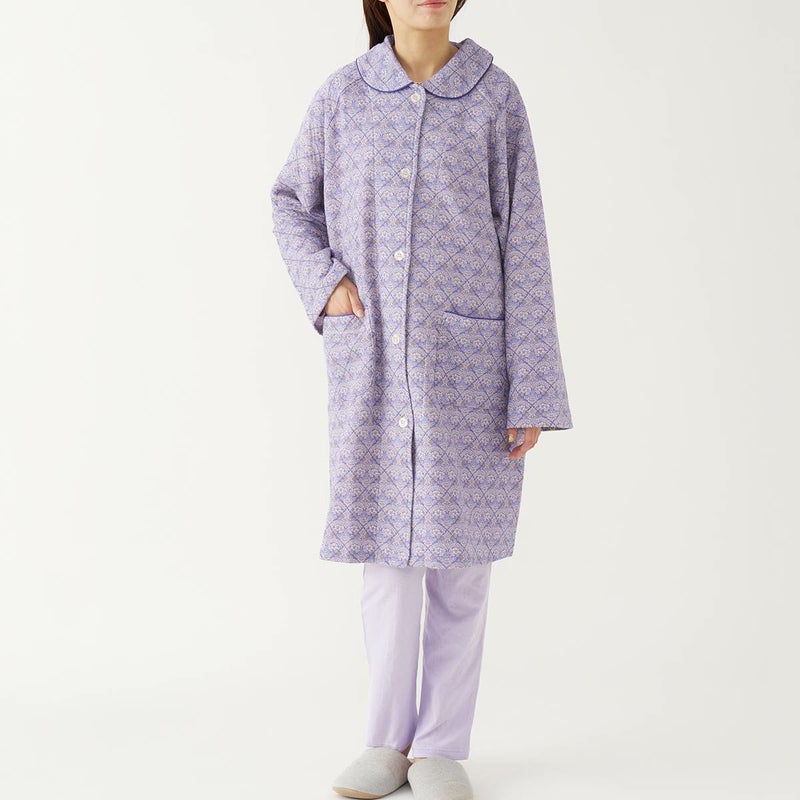 ボタニカルモチーフの幾何学柄構成プリント。中わたニットキルトは空気を含んで暖かい冬の定番素材。ラグラン袖のロングガウンです。中わた入りなので保温性があり、空気を含んで暖かく、甘く編んである生地を重ねた接結生地なのでふんわり柔らかなと触り心地です。表面、裏面は綿100%で肌に当たる面はの天然素材を使用しています。