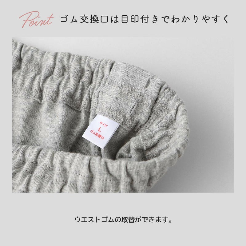 総丈:99.5cm、ウエスト(ゴム上がり):70cm、ヒップ:110.5cm、ワタリ:35.5cm、股上:31.5cm、股ぐり(前)34.5cm、股ぐり(後)43.5cm