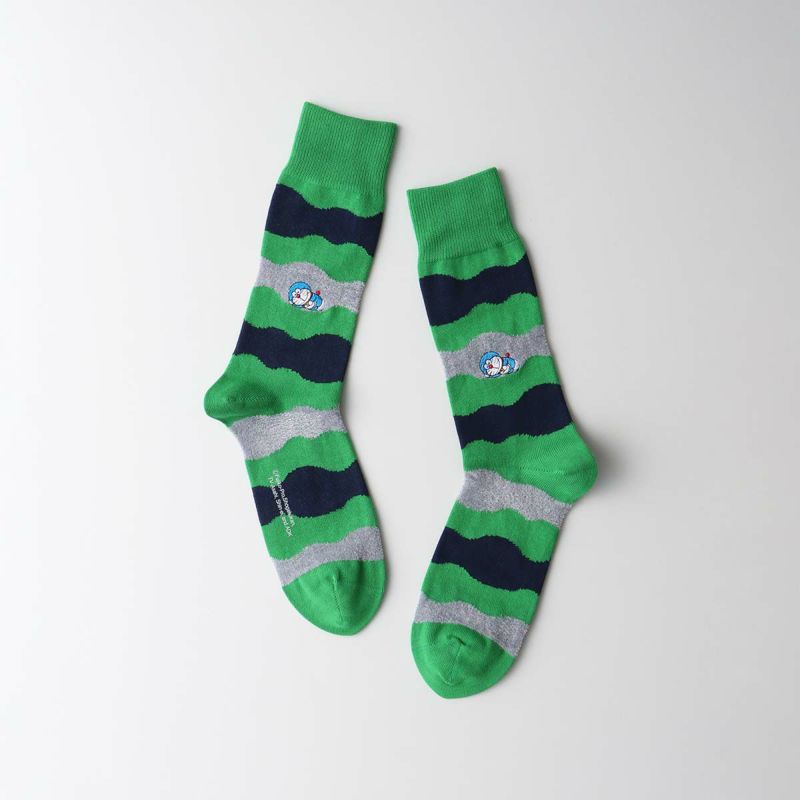 ドラえもんがお昼寝している姿のカジュアルソックスです。ボーダー柄が、かわいらしさを一層引き立てます。日常使いはもちろん、プレゼントにも最適です。