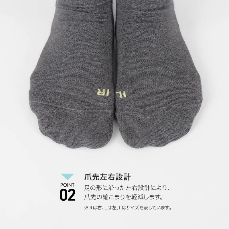 独自の「Anti Spread Foot機能」で横アーチを支え、足幅の広がりを防止します。また、足の形に沿った左右設計により、爪先の縮こまりを軽減します。