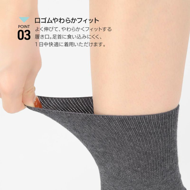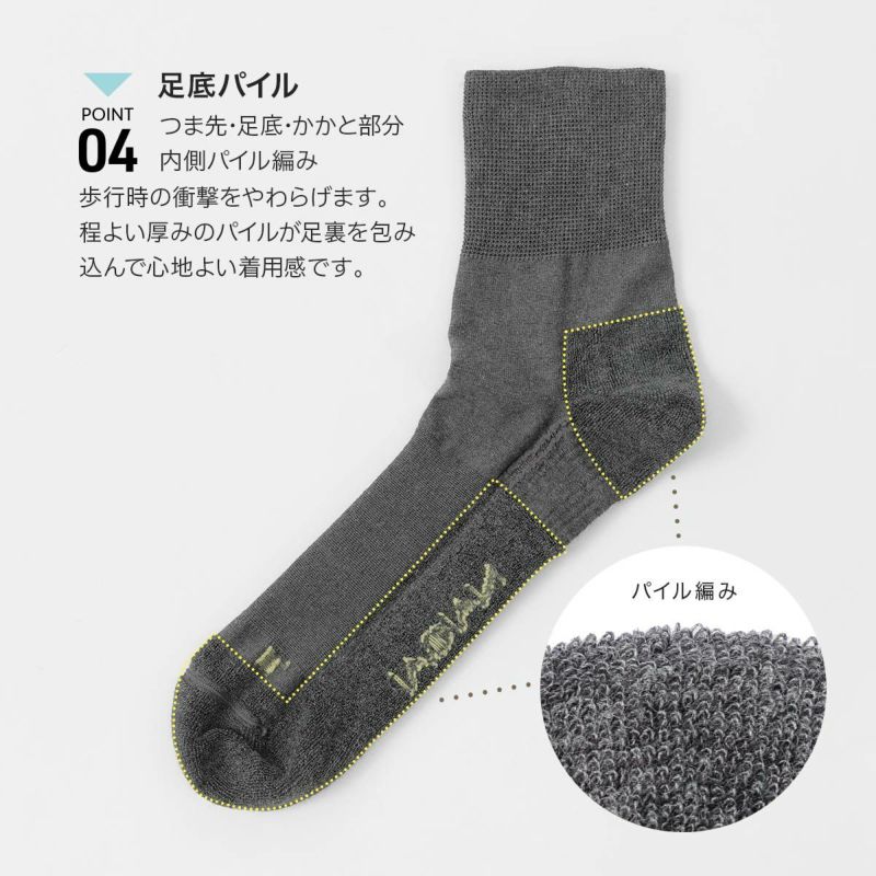 くちゴム部分は、よく伸びてやさしくフィット。足底部分にはクッション性に優れたパイル編みを採用など快適な履き心地を実現した機能性ソックスです。