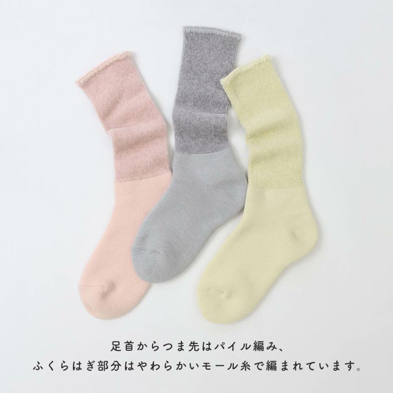 リクエストのお声が多かったロング丈が登場。足首からふくらはぎまでをすっぽり覆えるので、あたたかいです。足首からつま先はパイル編み、ふくらはぎ部分はやわらかいモール糸で編まれています。