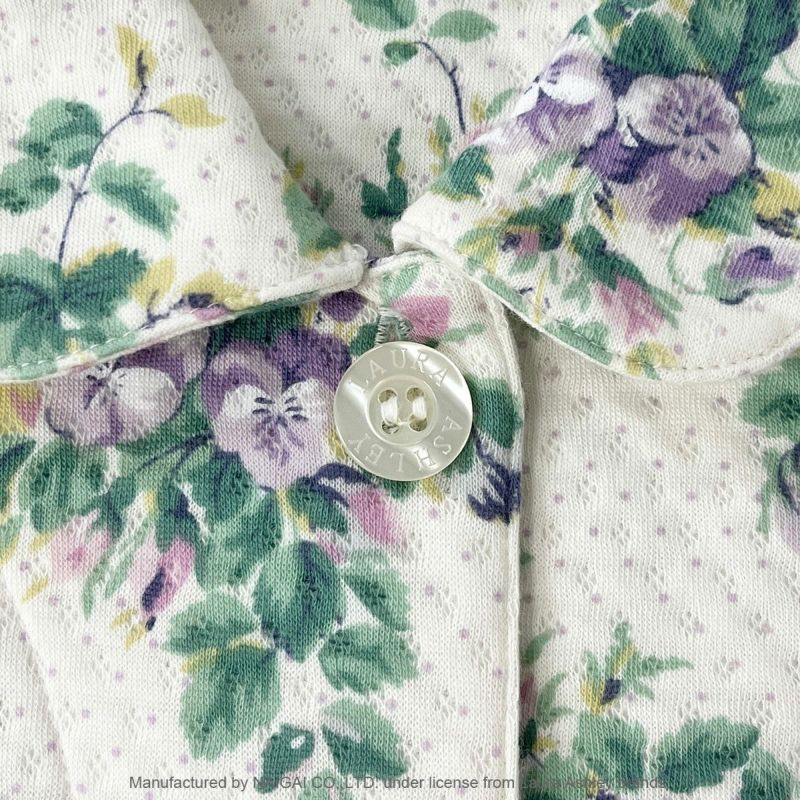 エレガントなルイース フローラル柄は、柔らかなパンジーの花とバラのつぼみを散りばめた繊細なフラワーデザインです。ローラ アシュレイアーカイブに保管されているこの魅力的なプリントは、1988年のホームファニチャーコレクションで使用されたものです。本国オリジナルのパープルと、英国本国監修のもとパジャマの為に作ったイエローの2色展開です。