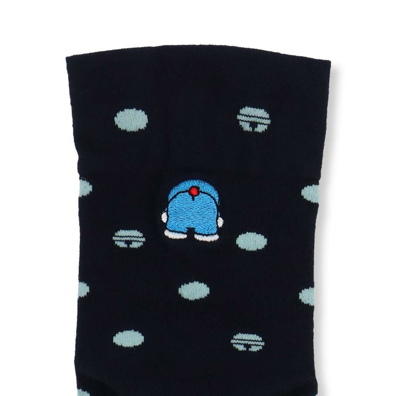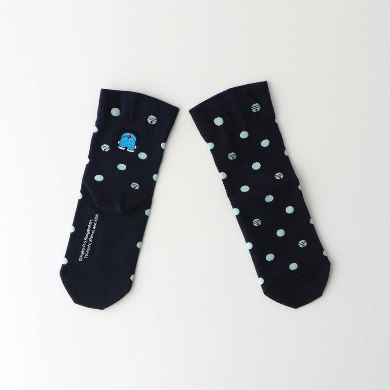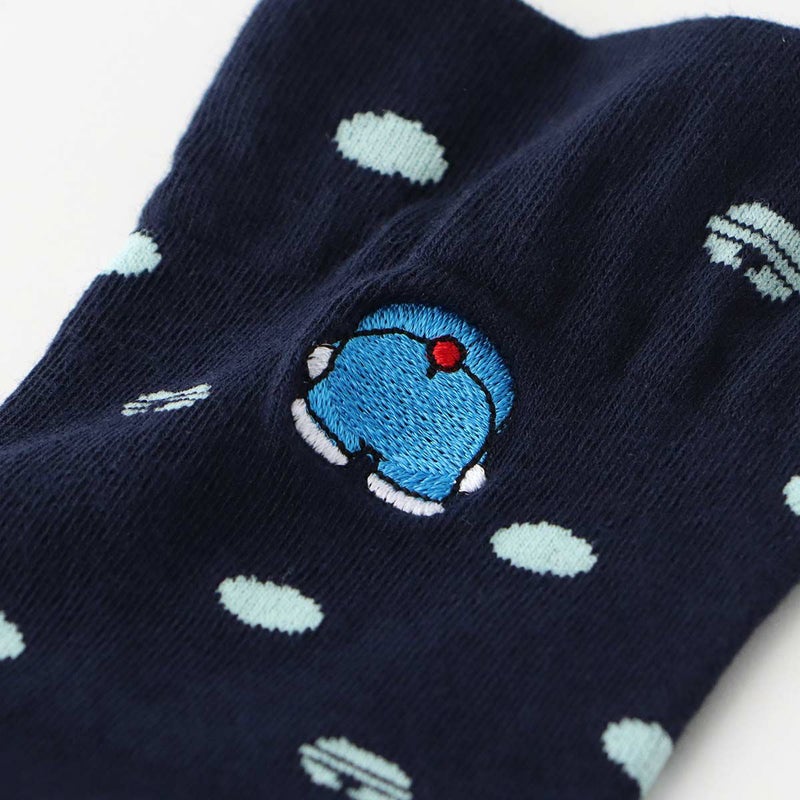 ドラえもんの象徴である鈴をドット柄にデザインし、ドラえもんの丸いフォルムとしっぽが刺繍された遊び心溢れるカジュアルソックスです。日常使いはもちろん、プレゼントにも最適です。