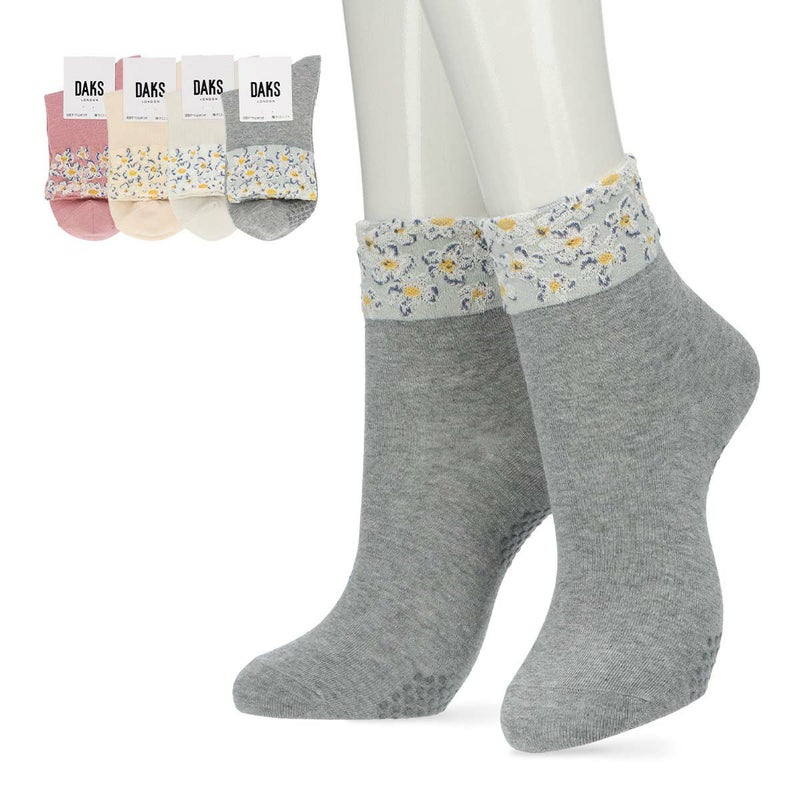 4. DAKS 履き口花柄フラット 綿混 クルー丈 ソックス 日本製 足底滑り止め付き レディース 03367465