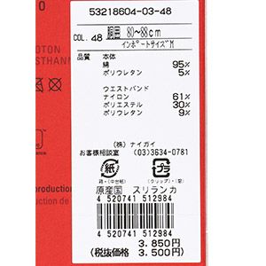 本体:コットン95% ポリウレタン5% ウエストバンド:ナイロン61% ポリエステル30% ポリウレタン9% |
