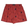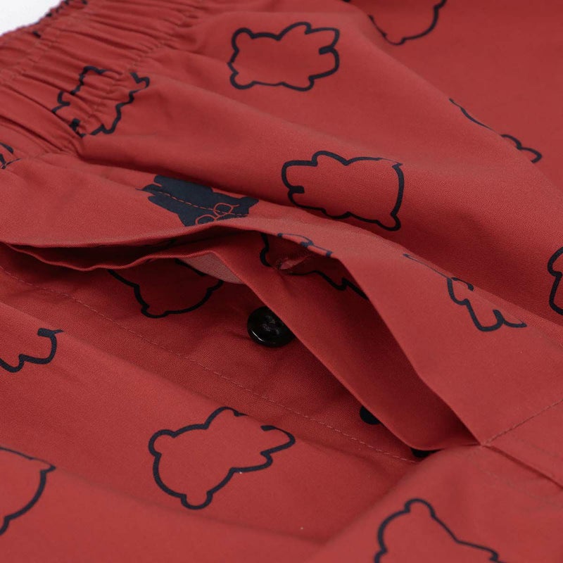 あそび心いっぱいの空飛ぶベアをちりばめた、ポップな総柄デザイン。少しスリムなシルエットですっきり穿けるデザイン。