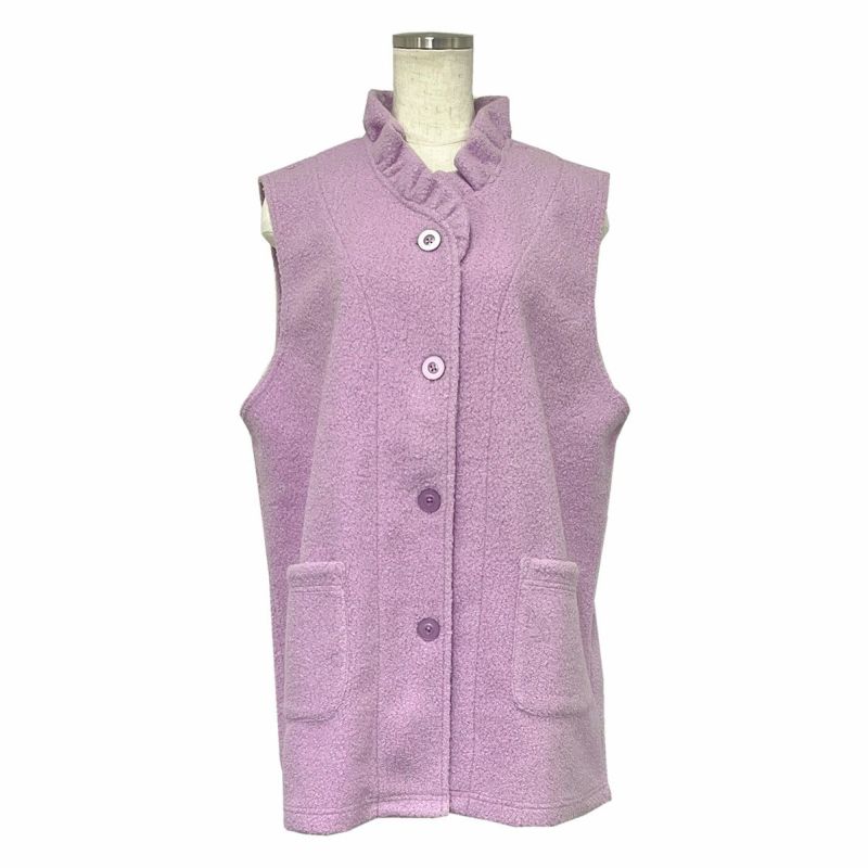 起床時、就寝前、就寝時、肌寒い時に羽織れるジレです。 表面がくるくる、もこもこしているボアフリース素材。 背宛・ポケット口見返しに中わたキルト使用。1枚仕立てで軽くて、裏起毛なのでふんわり暖かい。 衿付きなので首元暖かく、ギャザーのデザインがエレガントな印象です。 背中から腰回りまで覆って暖かく、まっすぐポケット付きで便利。