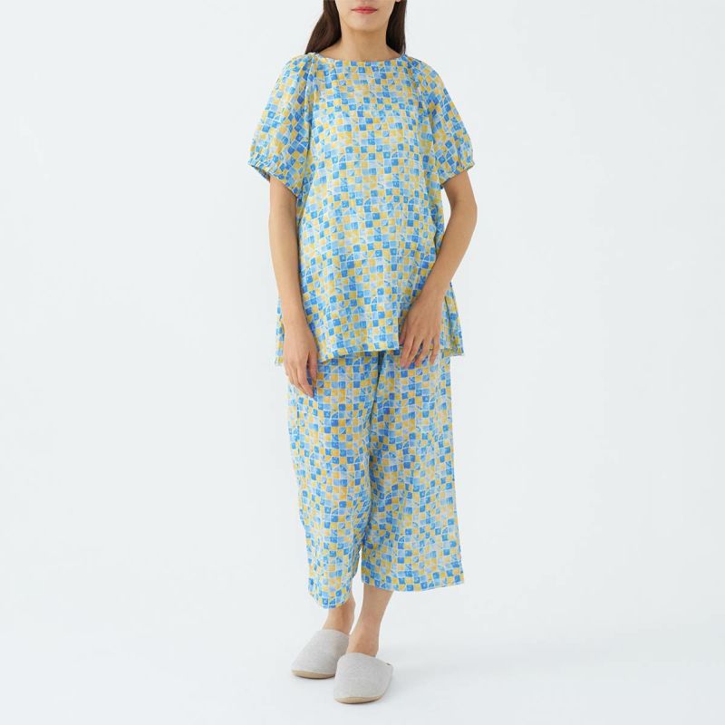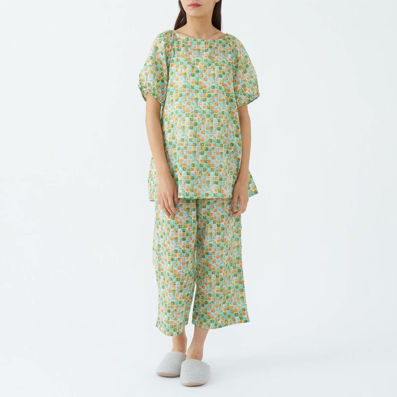 半袖 8分丈パンツの上下セット。ステンドグラスのような透明感のある幾何学柄プリントです。長め半袖に部屋着感覚のワイドパンツが特徴的なスタイルのかぶりものパジャマです。