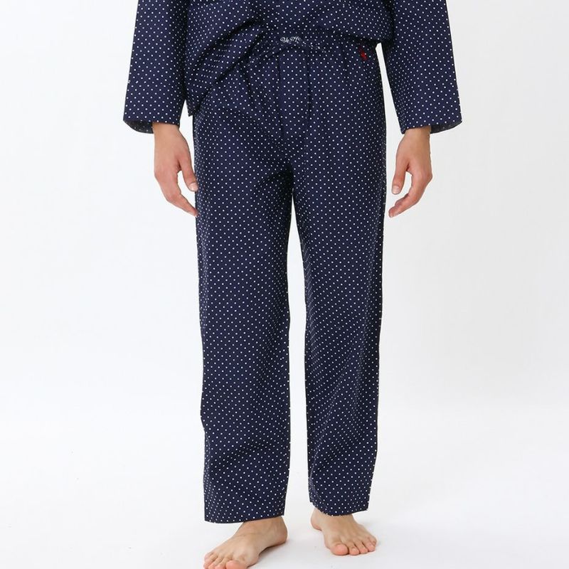 オーガニックコットン100%の長袖パジャマセットです。 表面がなめらかで光沢のある平織生地を採用。 ゆったりとしたサイズ感で、リラックスした着心地が特長。左胸のポケットの上にレッドで入れたブランドアイコンのポロプレイヤー刺繍もポイントです。 ネイビーベースにホワイトのピンドットをオールオーバープリントした、シーズンを選ばず着用できる定番アイテムです。 前開きなのでおしゃれな入院着としてもおすすめです。 お誕生日のお祝いやプレゼント、ワンランク上のギフトとしても最適です。
