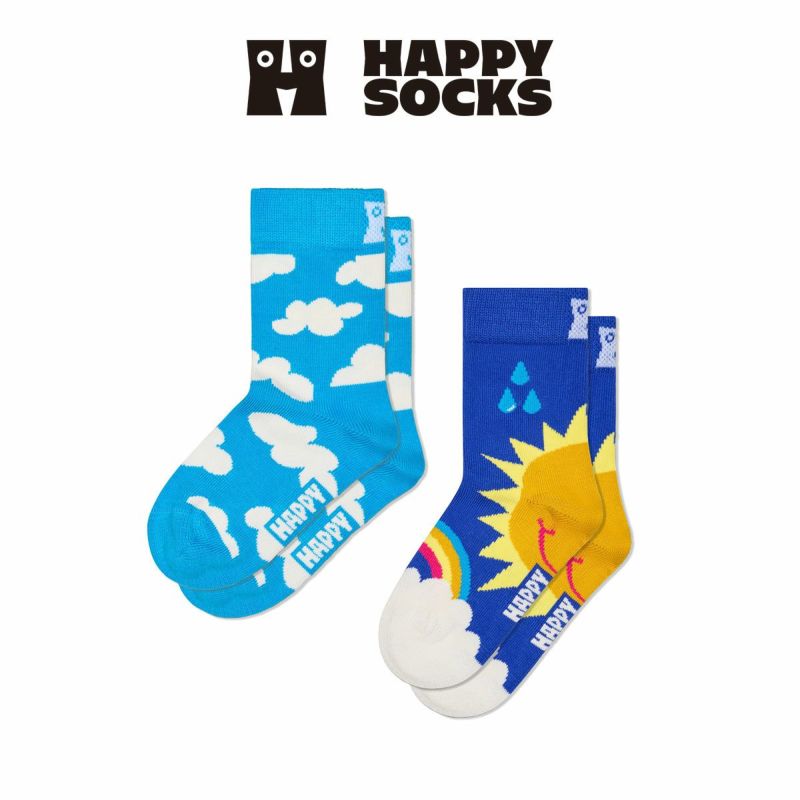 柔らかく白いパフが付いたような雲の靴下と、にっこり元気な太陽達が描かれた、対照的なデザインが魅力的。小さな足指と大きな想像力に、遊び心のあるルックが完成します。
