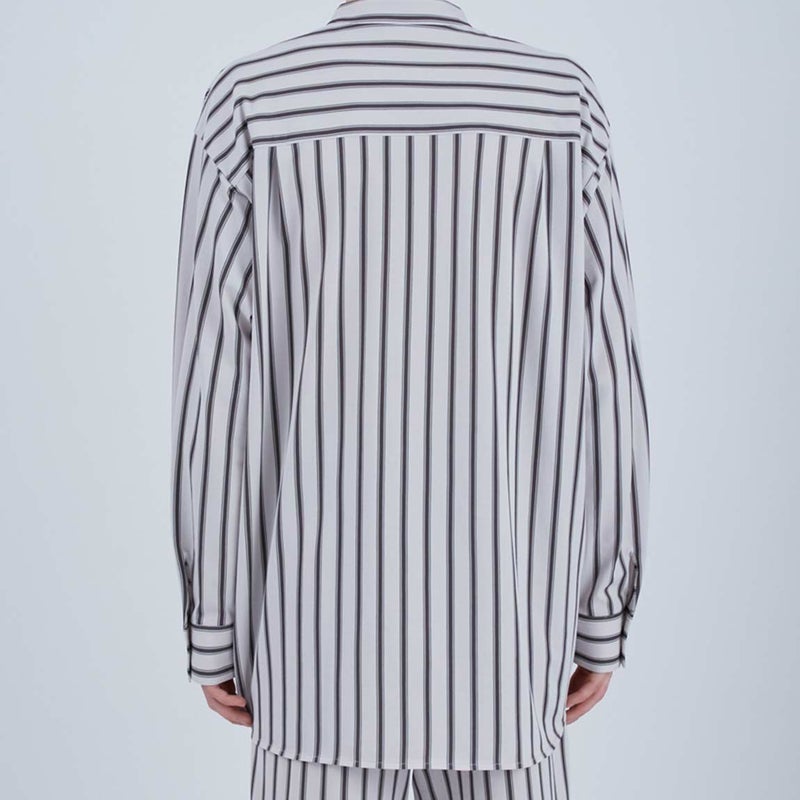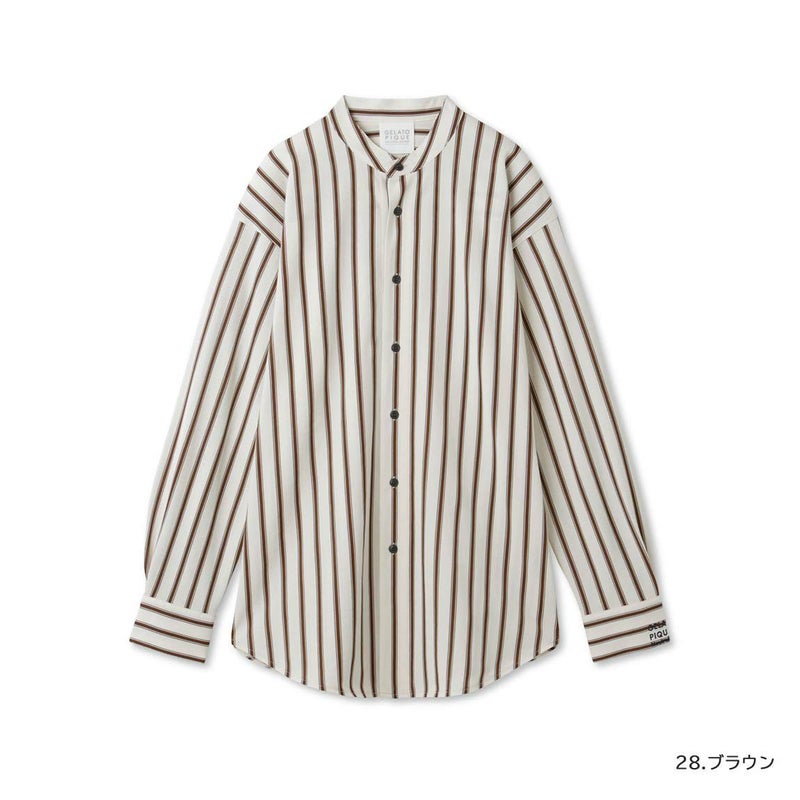 ユニセックスでお楽しみいただける、爽やかなストライプ柄のルームウェアです。すっきりと着こなせるスタンドカラーのシャツは、左カフスに入れた刺繍糸とボタンの色を揃えたおしゃれなデザイン。柔らかいコットン混の素材は1枚で着ても、同時期のポンチプルオーバーのインナーに着てストライプをチラ見せするのもアリです。色はブラウンとグレーの2色展開。ボトムにはお揃い柄のロングパンツを合わせてお楽しみください。