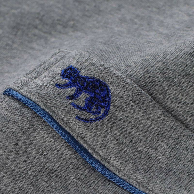 配色のパイピングディティールと、紳士靴下でも展開する共通のブルーレオパード刺繍がポイント。程よく暖かく柔らかい接結天竺は人気の素材です。