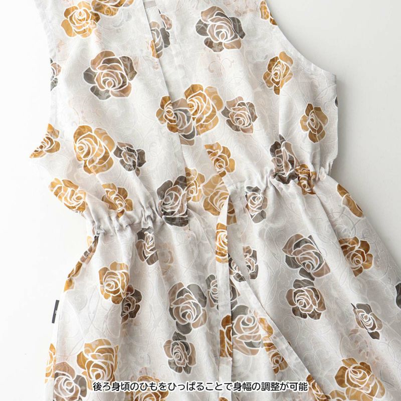 肩ひもではないので着くずれしにくいです。後ろ身ごろの腰ひもを引っぱって身巾を調整することができます。袖を通して着用できるので着脱がしやすい。エプロンですが洋服見えするスタイルで近年はこのスタイルが主流になってきています。