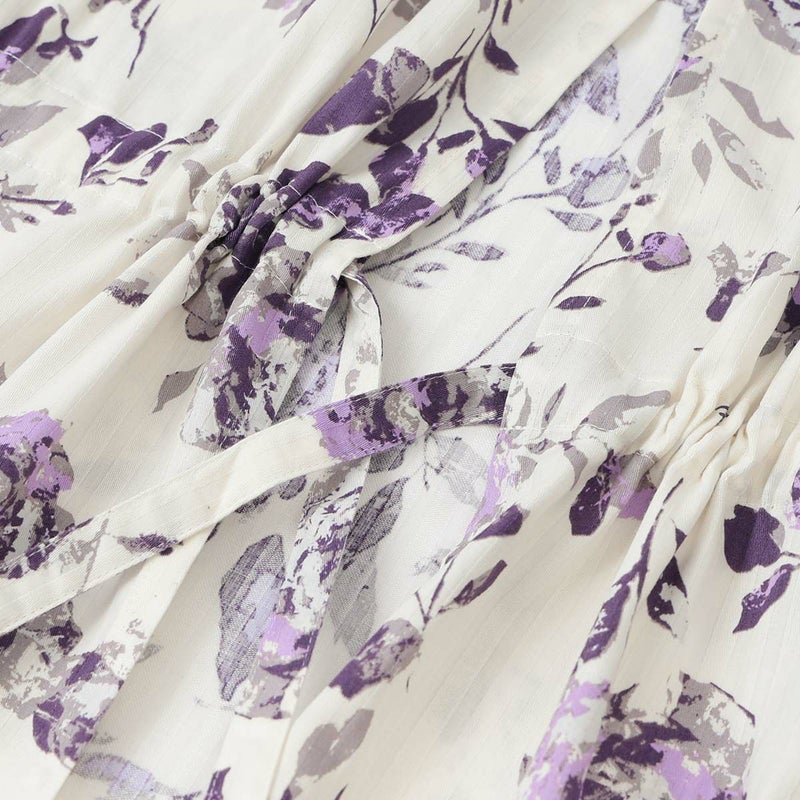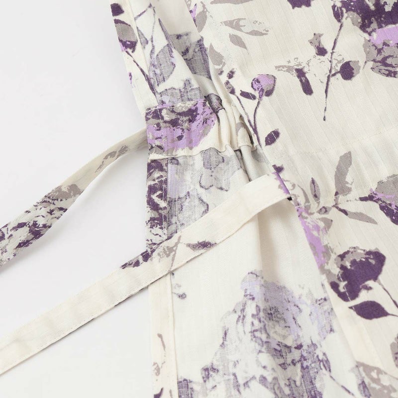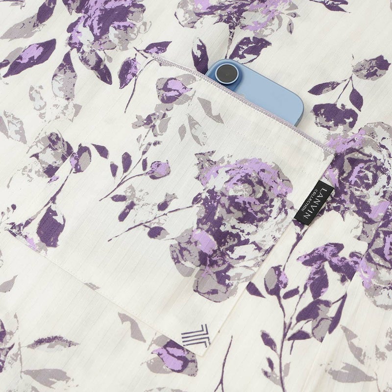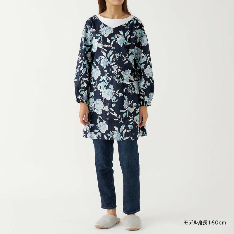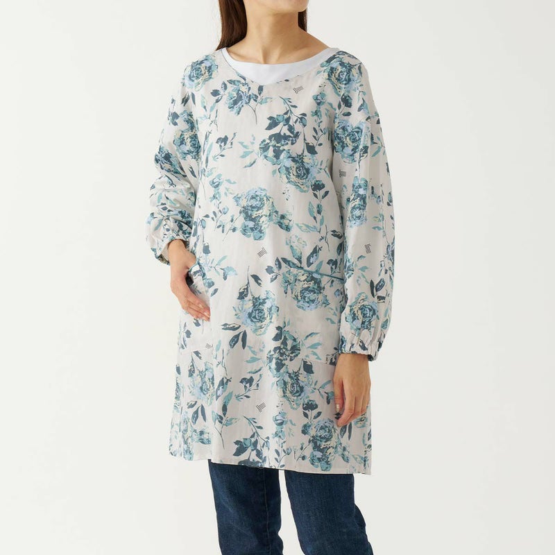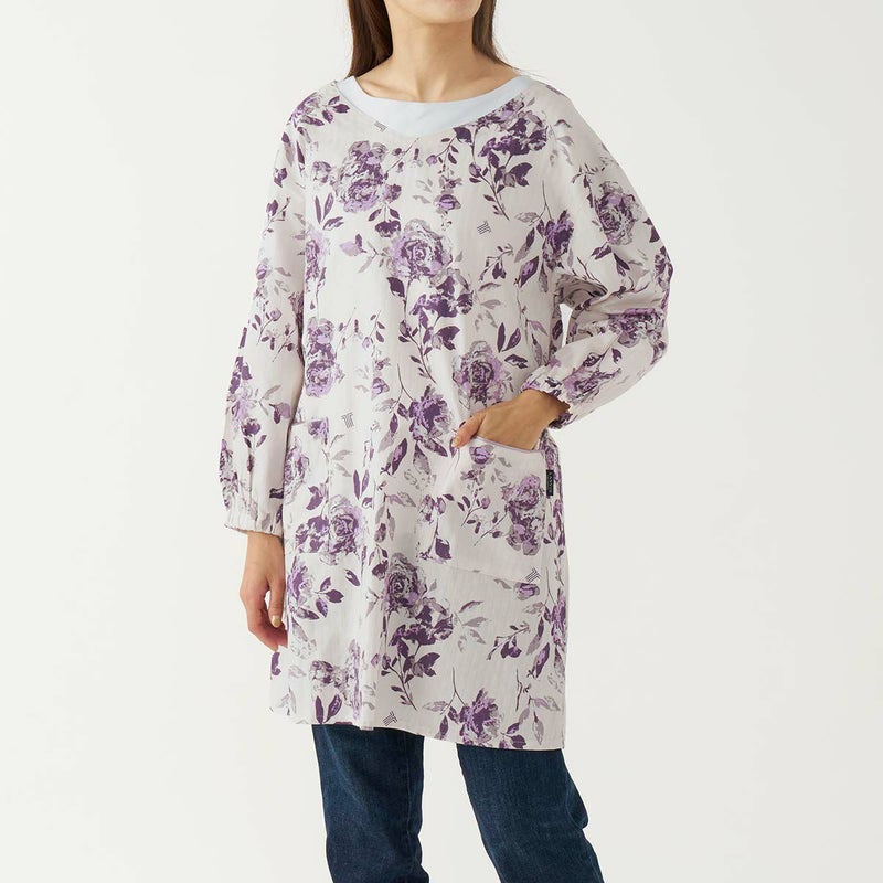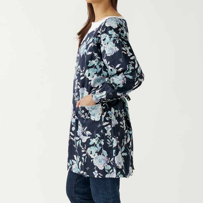 後結びエプロンは体格に合わせてサイズ調整できるので、どなたでも着やすいのが特長です。ロングスリーブは冷える季節の暮らしをしっかり支えます。大人シックな総柄でランバンのエレガントな世界観を表現。