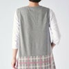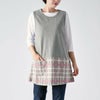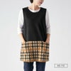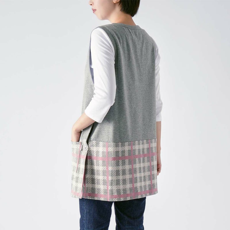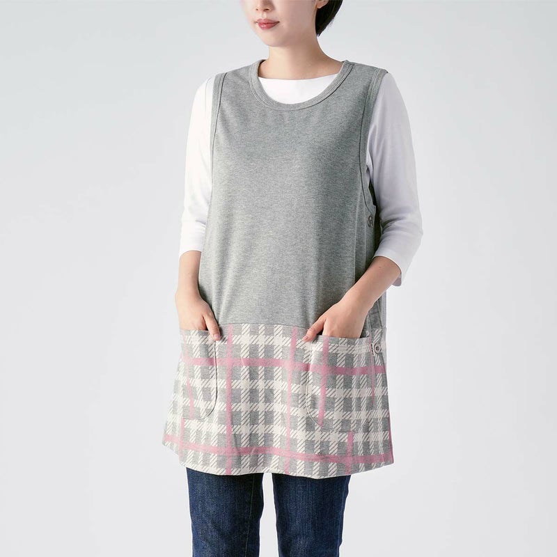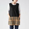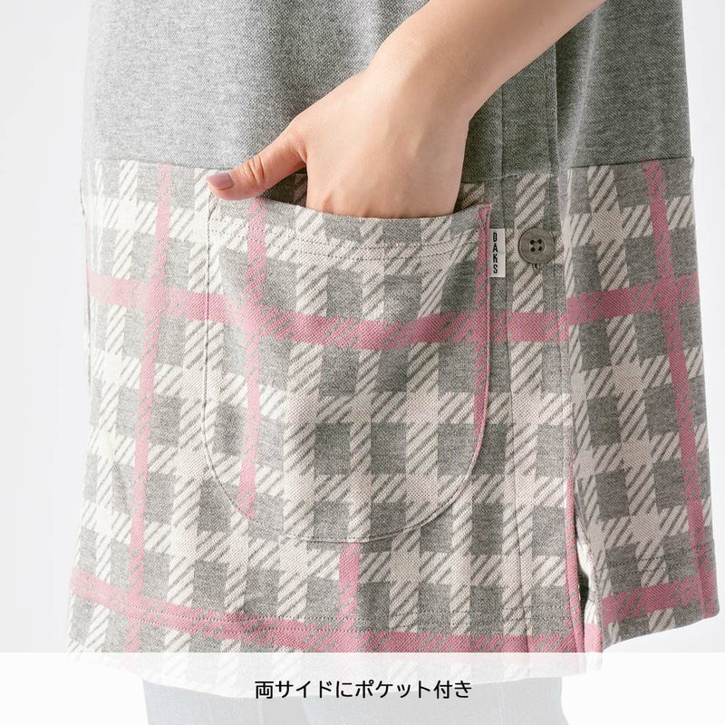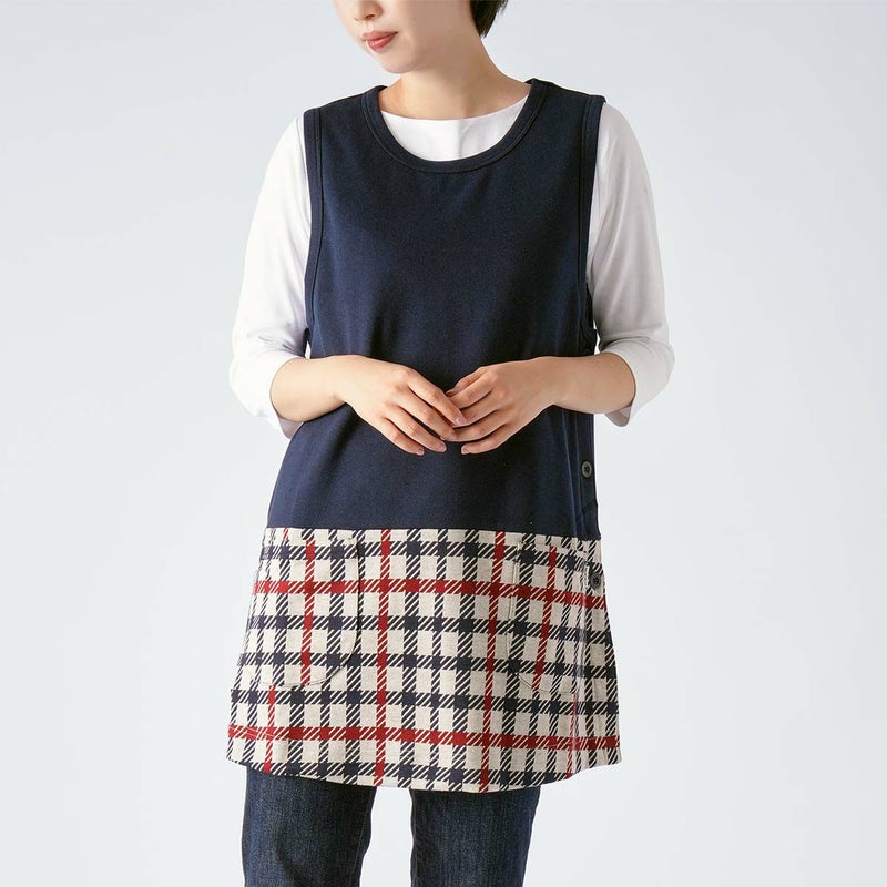 ダックスを象徴するチェック柄をジャガード編みで再現したチュニックエプロン です。厚すぎず薄すぎない柔らかな中肉素材になります。上身頃には無地を使用しているので上半身がスッキリとしたイメージになり、チェック柄が引き立ちます。左脇には3つ釦が付き、1つ1つ取り外す事が可能です。前面腰回りには小物など入れたり便利なポケットが2つ付いています。少し短めの着丈なので足さばきもよく、パンツなどのアイテムと相性も良いです。