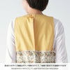 肩ひもではないので着くずれしにくいです。後ろ身ごろの腰ひもを引っぱって身巾を調整することができます。袖を通して着用できるので着脱がしやすい。エプロンですが洋服見えするスタイルで近年はこのスタイルが主流になってきています。