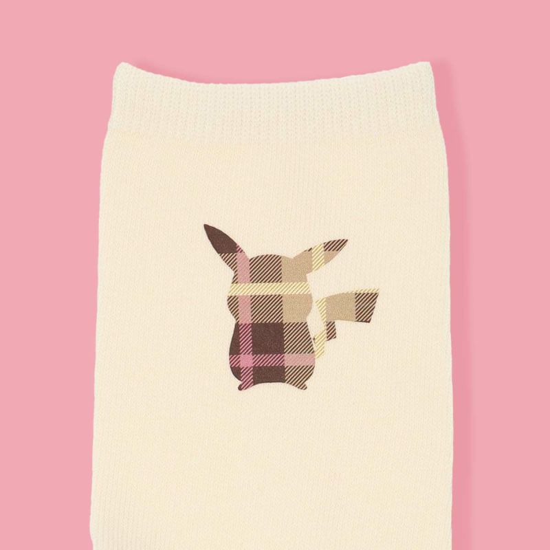 ポケモン ピカチュウのシルエットにチェック柄のワンポイントがプリントされた レディース クルー丈 ソックス です。日常使いはもちろん、ピカチュウ好きの方へのプレゼントにもぴったりです。