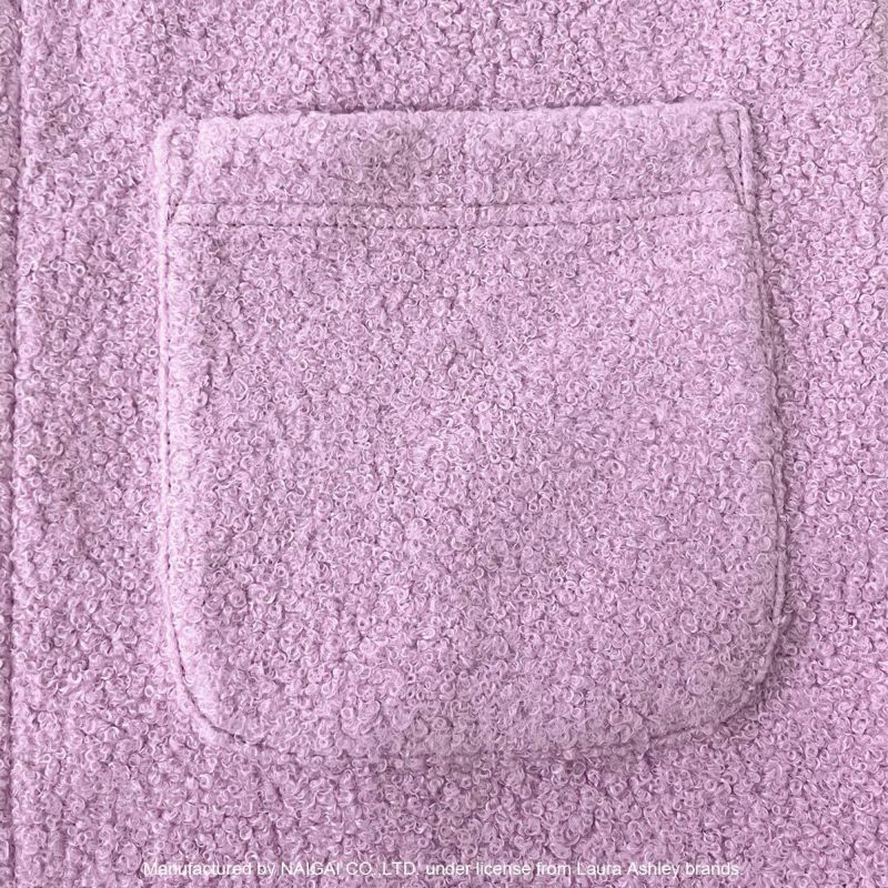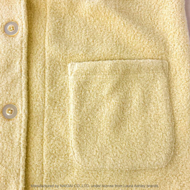 起床時、就寝前、就寝時、肌寒い時に羽織れるジレです。 表面がくるくる、もこもこしているボアフリース素材。 背宛・ポケット口見返しに中わたキルト使用。1枚仕立てで軽くて、裏微起毛なのでふんわり暖かい。 衿付きなので首元暖かく、ギャザーのデザインがエレガントな印象です。 背中から腰回りまで覆って暖かく、まっすぐポケット付きで便利。