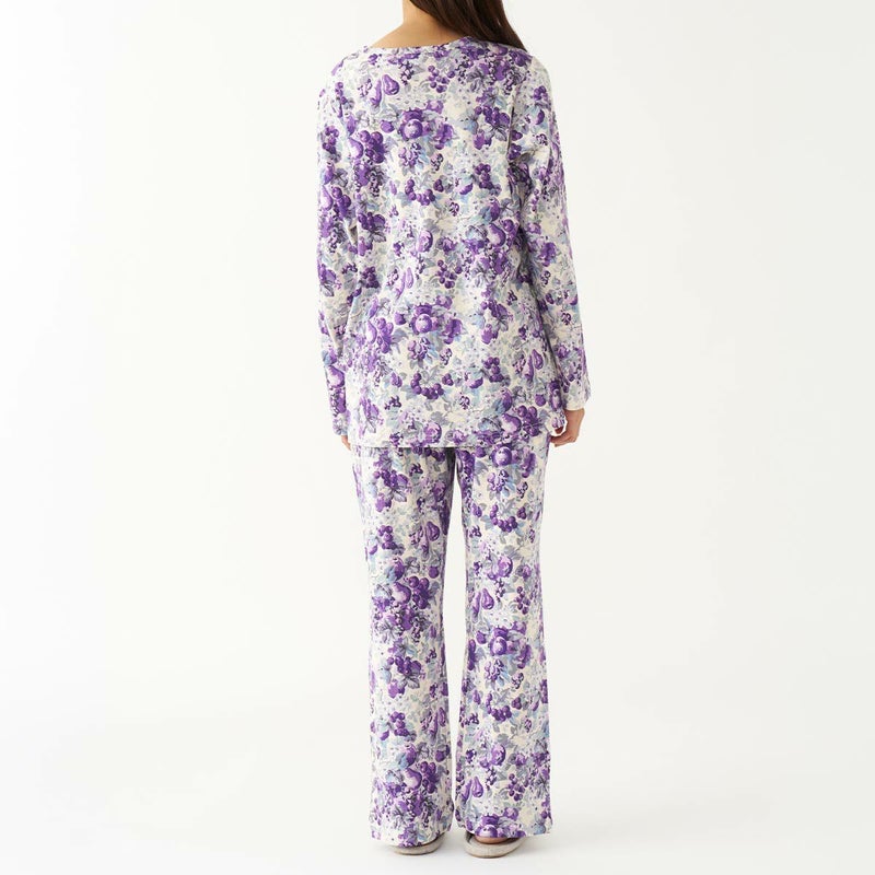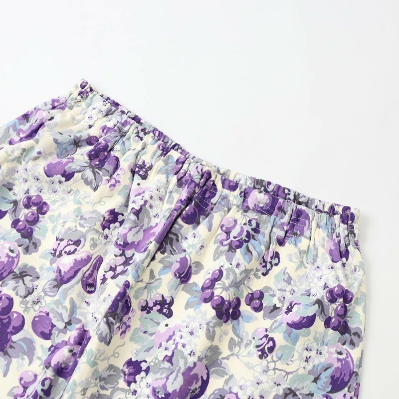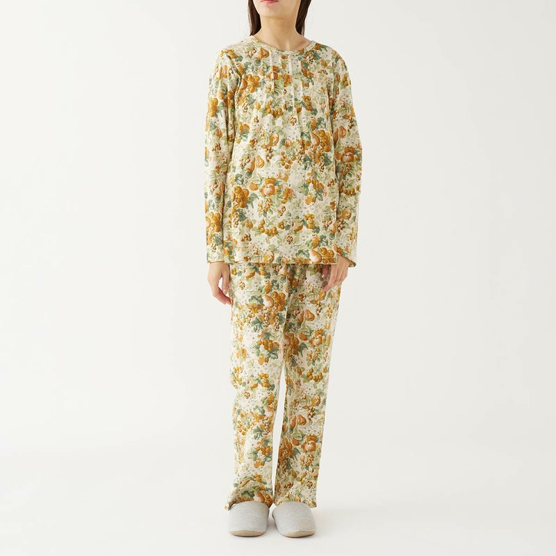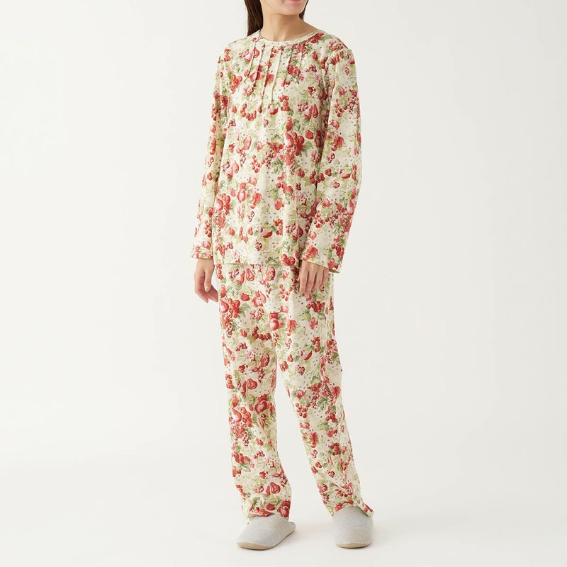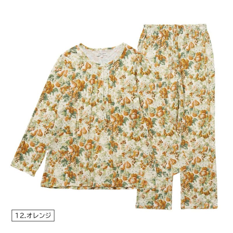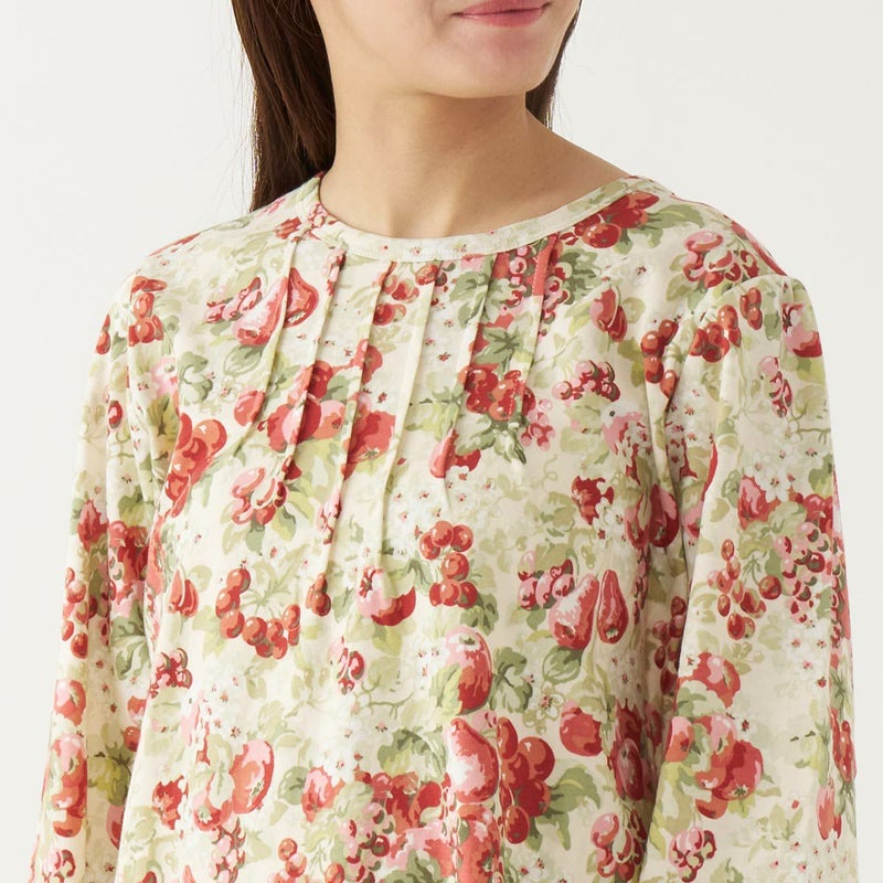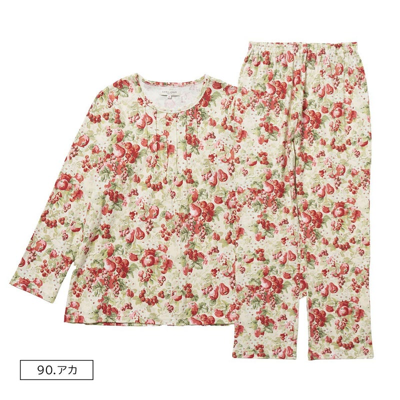 華やかなプリントがローラアシュレイらしい木の実をモチーフにしたプリント。タック入りのシンプルなかぶりデザインパジャマです。生地は中薄手なので、秋~冬着用向けです。