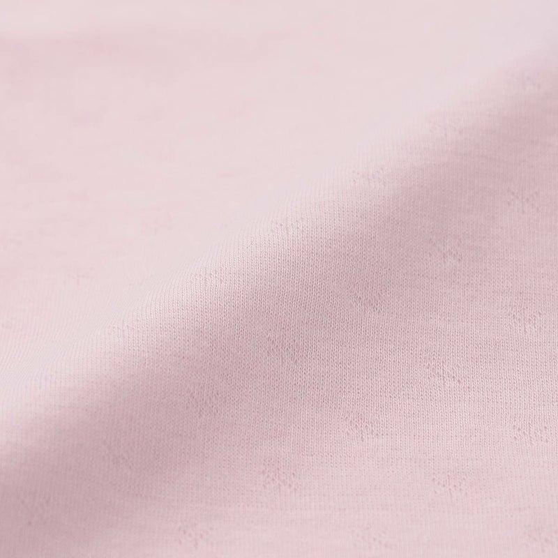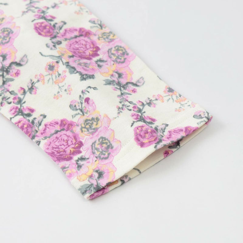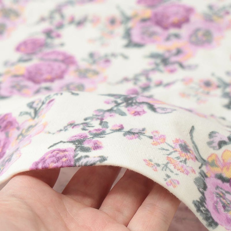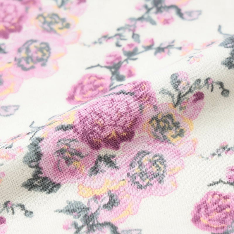立葵の花をモチーフにグラフィカルに構成したホリホックス。チュニック丈トップスに細め無地パンツのリラクシングスタイルです。生地は中薄手なので、秋~冬着用向けです。接結天竺という薄手の天竺を2枚重ねた素材は、間に空気の層を生むことで冬でも暖かさを保ち、ふんわりと包み込まれるような着心地を実現しています。