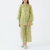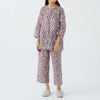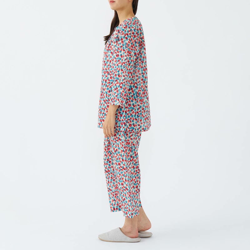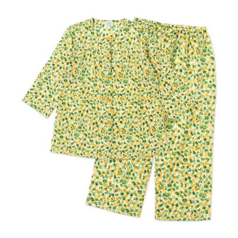 胸元切り替えにギャザーが控えめに入った前開きスタイルで、ソフトな薄手のパジャマです。