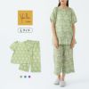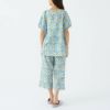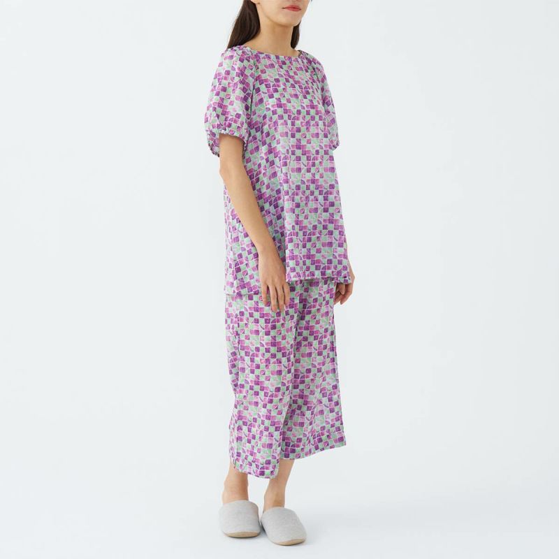 半袖 8分丈パンツの上下セット。ステンドグラスのような透明感のある幾何学柄プリントです。長め半袖に部屋着感覚のワイドパンツが特徴的なスタイルのかぶりものパジャマです。
