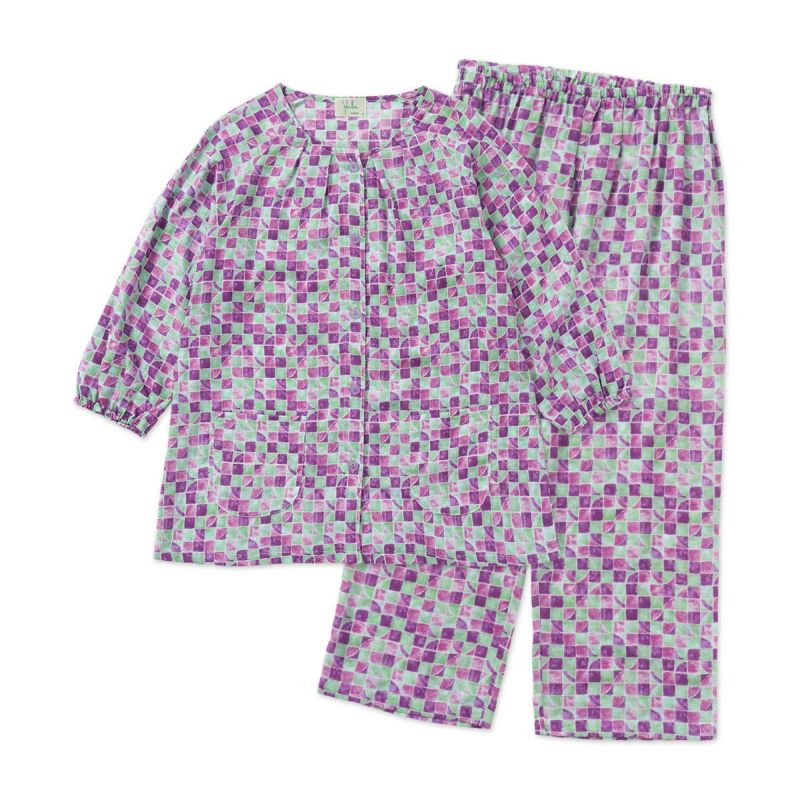 8分袖 8分丈パンツ上下セット。ステンドグラスのような透明感のある幾何学柄プリントです。前見頃にタックの入った前開きパジャマです。