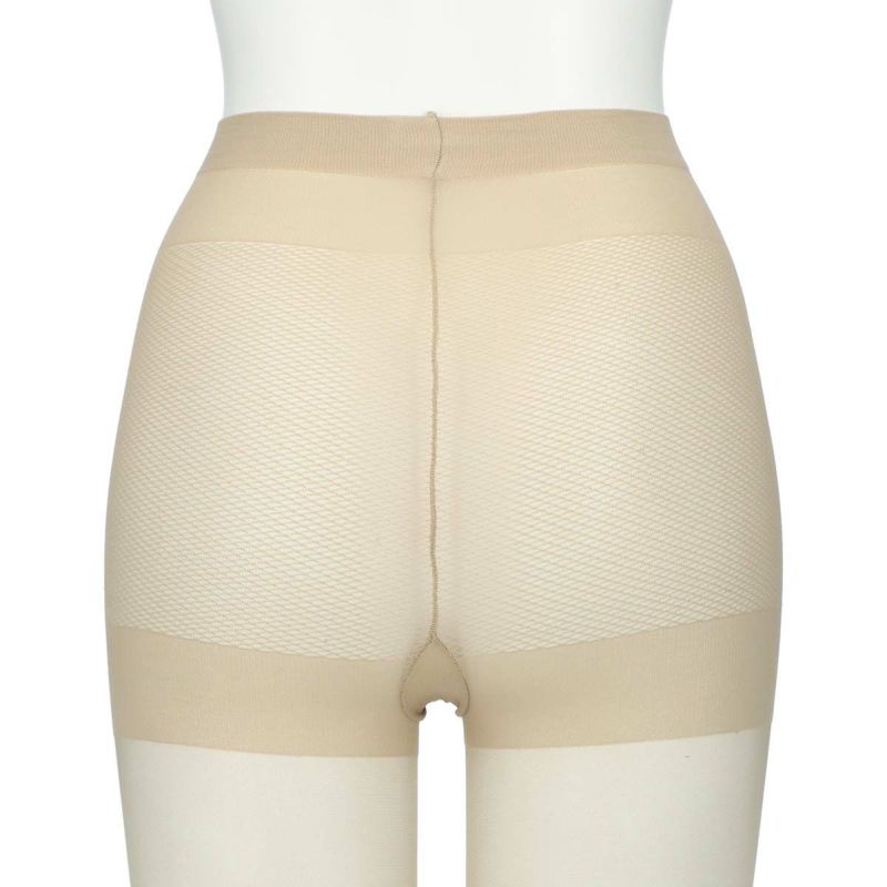 パンティー部がメッシュ編みなので通気が良く、本体部にはサラッとした肌触りが続く高吸放湿性ナイロン(東レ「QUUP」)を使用。暑い時期に重宝するシアーサポートストッキングです。