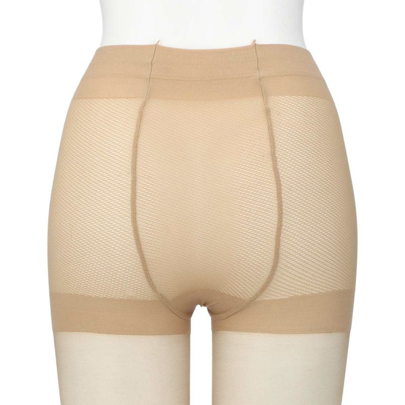 パンティー部がメッシュ編みなので通気も良く、本体部には高吸放湿性ナイロン(東レ「QUUP」)を使用したシアーサポートストッキングです。(SCY交編、マチ付、パンティ部メッシュ編み、つま先部スルー、キシリトール加工、足形セット、ゆったりサイズ) |