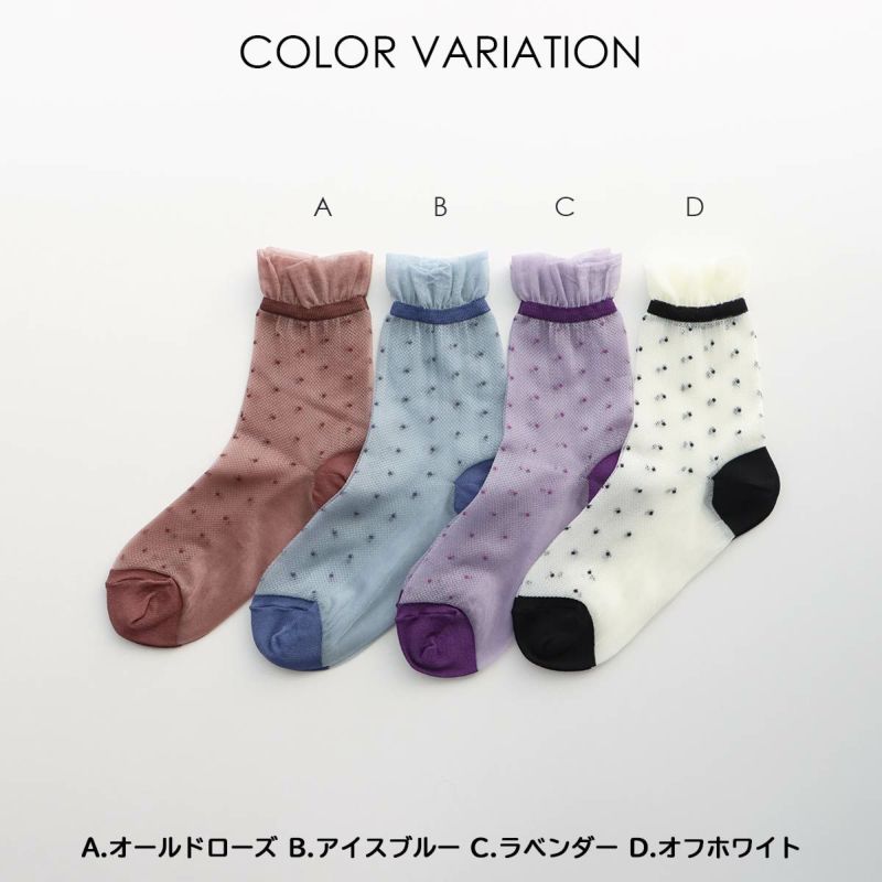 レトロなドット柄に履き口のフリルが可愛いデザインの靴下です。