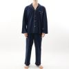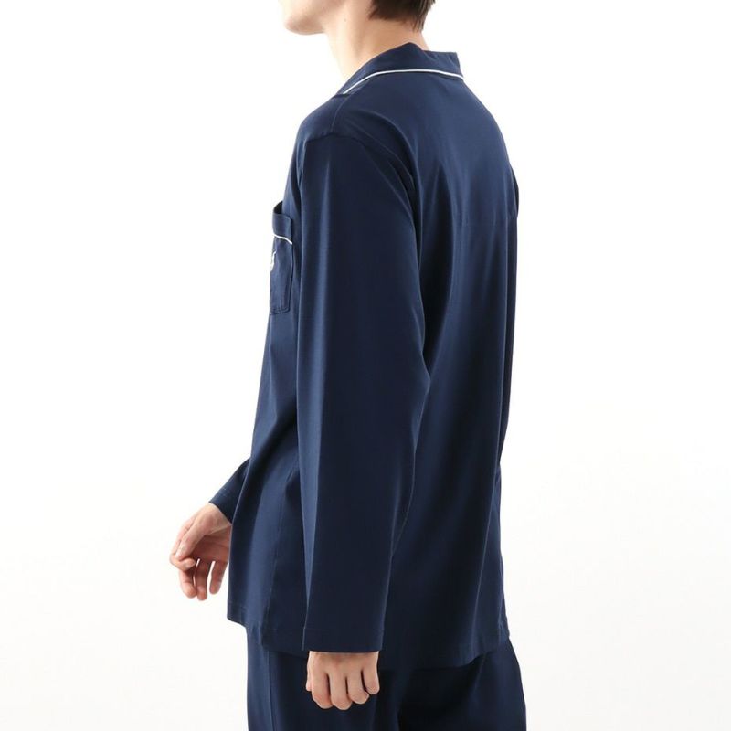 オーガニックコットン100%の長袖パジャマセットです。 表面がなめらかで光沢のある平織生地を採用。 ゆったりとしたサイズ感で、リラックスした着心地が特長。左胸のポケットの上にレッドで入れたブランドアイコンのポロプレイヤー刺繍もポイントです。 ネイビーベースにホワイトのピンドットをオールオーバープリントした、シーズンを選ばず着用できる定番アイテムです。 前開きなのでおしゃれな入院着としてもおすすめです。 お誕生日のお祝いやプレゼント、ワンランク上のギフトとしても最適です。