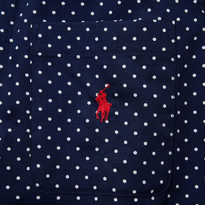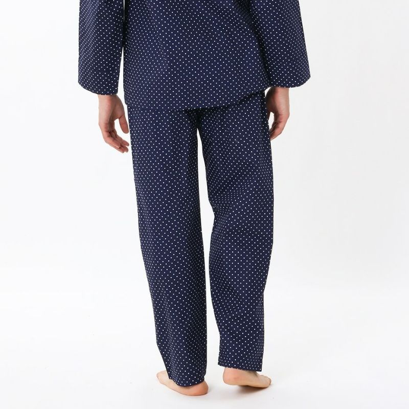オーガニックコットン100%の長袖パジャマセットです。 表面がなめらかで光沢のある平織生地を採用。 ゆったりとしたサイズ感で、リラックスした着心地が特長。左胸のポケットの上にレッドで入れたブランドアイコンのポロプレイヤー刺繍もポイントです。 ネイビーベースにホワイトのピンドットをオールオーバープリントした、シーズンを選ばず着用できる定番アイテムです。 前開きなのでおしゃれな入院着としてもおすすめです。 お誕生日のお祝いやプレゼント、ワンランク上のギフトとしても最適です。