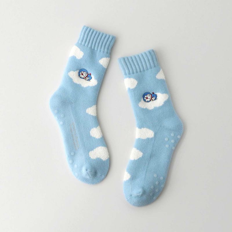 靴下全体に散りばめられた雲柄に、可愛らしいドラえもんが刺繍されたカジュアルルームソックスです。おうち時間を快適に、足元の冷えにお悩みの方にもピッタリなルームソックスです。足裏に滑り止めが付いていますので、フローリングなど滑りやすい場所でも安心です。日常使いはもちろん、プレゼントにも最適です。