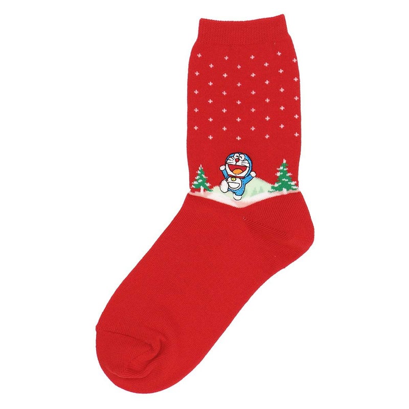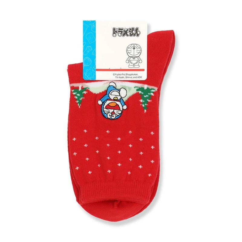 靴下に散りばめられた雪柄に、可愛らしいドラえもんの刺繍が施されたカジュアルソックスです。日常使いはもちろん、プレゼントにも最適です。
