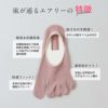 『親指セパレート設計』親指と人差し指の間をあけ、本来の足指の形に近づけることで着用時のつっぱり感を軽減する快適フィット設計です。(特許番号 6677690)