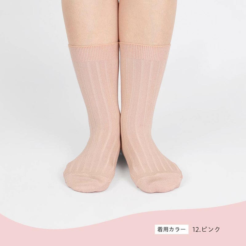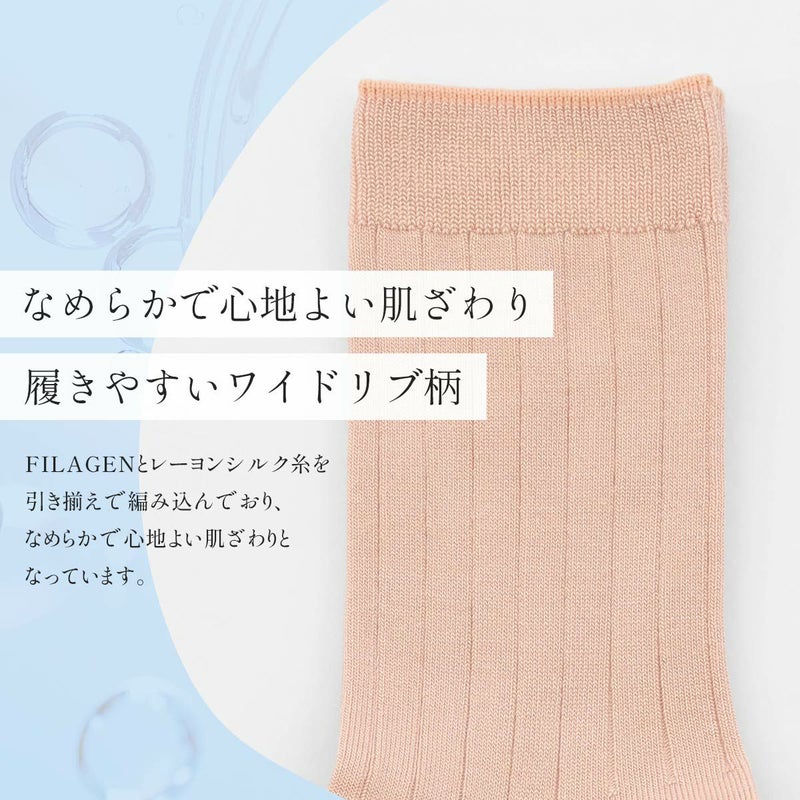 海洋性コラーゲンペプチドが練りこまれている、レーヨン糸 "FILAGEN" を使用した レディース クルー丈 ソックスです。履きやすいワイドリブ柄。FILAGENとレーヨンシルク糸を引き揃えで編み込んでおり、なめらかで心地よい肌ざわりとなっています。薄めの生地感なので、パンプスやフラットシューズにあわせて履いていただけます。