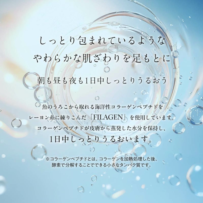 魚のうろこから取れる海洋性コラーゲンペプチドをレーヨン糸に練りこんだ「FILAGEN」を使用。コラーゲンペプチドが皮膚から蒸発した水分を保持し、 朝も昼も夜も1日中しっとりうるおいます。