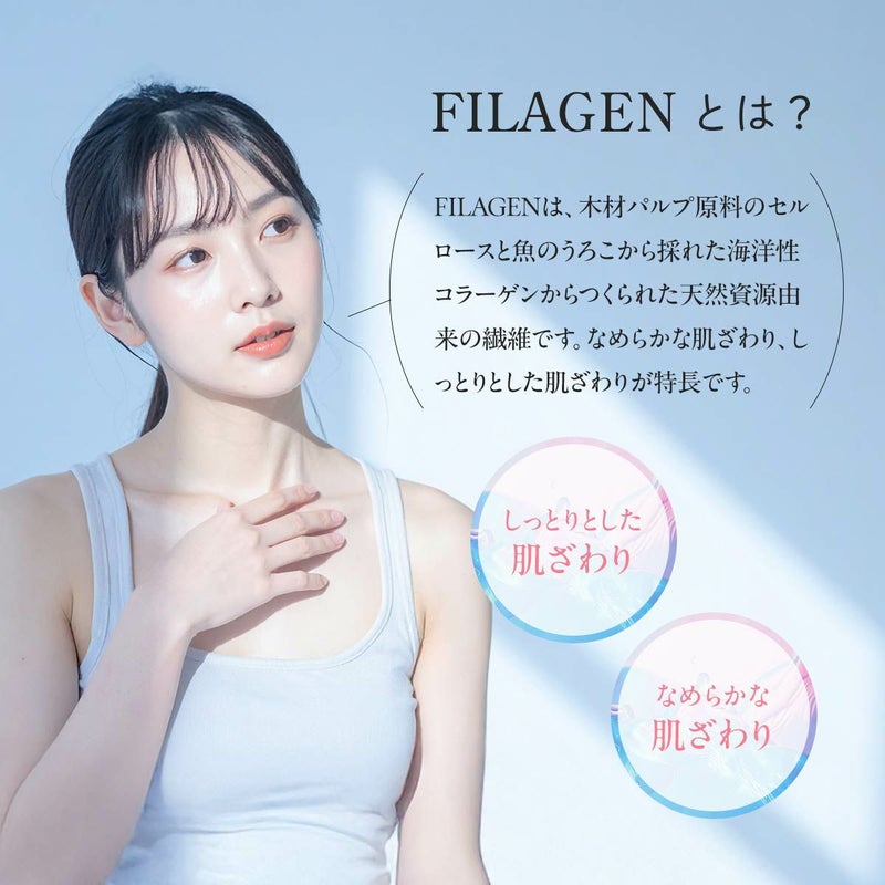 FILAGENは、木材パルプ原料のセルロースと魚のうろこから採れた海洋性コラーゲンからつくられた天然資源由来の繊維です。なめらかな肌ざわり、しっとりとした肌ざわりが特長です。コラーゲンペプチドは繊維に練りこまれているため、繰り返しの洗濯後もコラーゲンペプチドは残り続け、肌触りのしっとり感をキープします。