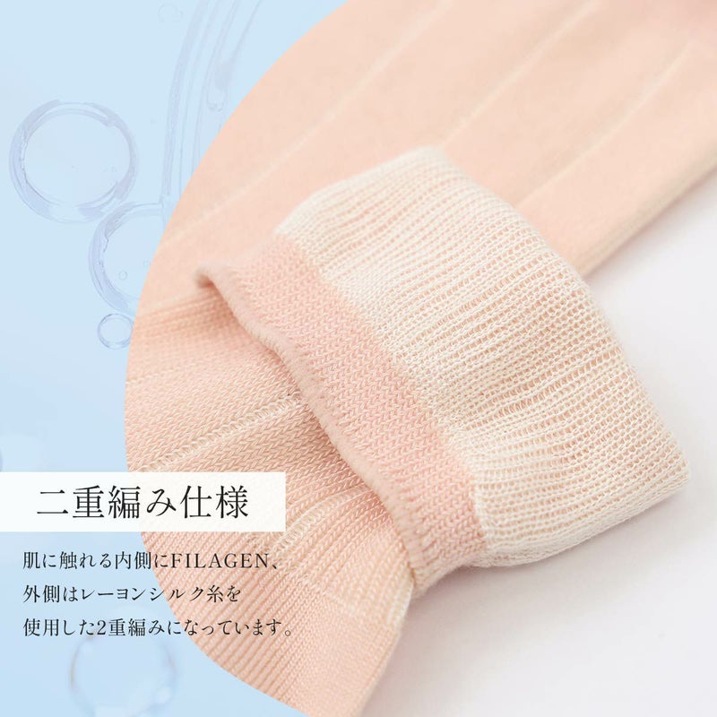 海洋性コラーゲンペプチドが練りこまれている、レーヨン糸 "FILAGEN" を使用した レディース ベッド ソックスです。肌に触れる内側にFILAGEN、外側はレーヨンシルク糸を使用した2重編みになっています。就寝時やリラックスタイムにおすすめのベッドソックスです。2重構造の編地が足元を優しくあたためます。